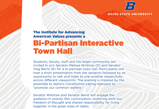 Please join Sen. Melissa Wintrow and Sen. Bernt for an exciting interactive program hosted by Boise State’s Institute for Advancing American Values. The event will center on table conversations where attendees will explore what it truly means to advance the “common welfare” in our state—a foundational value found in the preamble and throughout Idaho’s Constitution. The event includes a short presentation followed by facilitated conversation across different viewpoints, inspired by Idaho’s Constitution and its call to promote “our common welfare.” Event questions can be sent to specialevents@boisestate.edu.